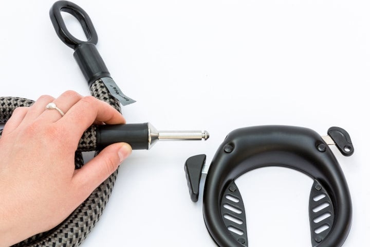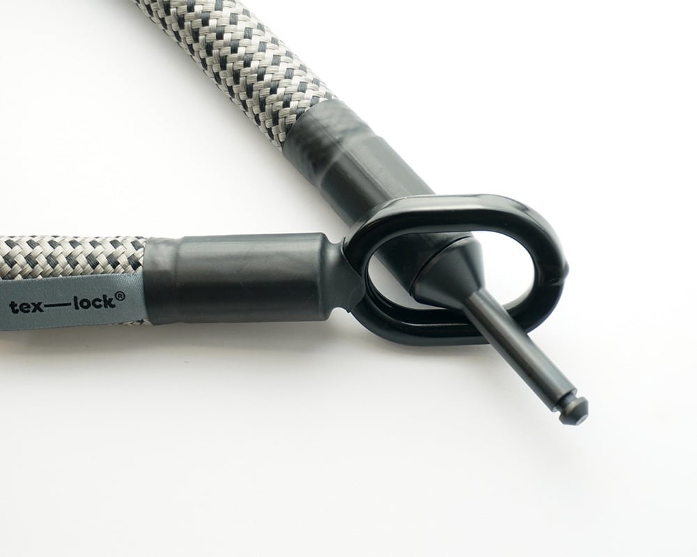 Net als de Tex-Lock Eyelet is ook de Tex-Lock Mate een op textiel gebaseerde kabel met oog. Maar bij de Tex-Lock Mate zit aan het andere uiteinde een pin. Deze zwarte pin past in vrijwel alle gangbare framesloten.