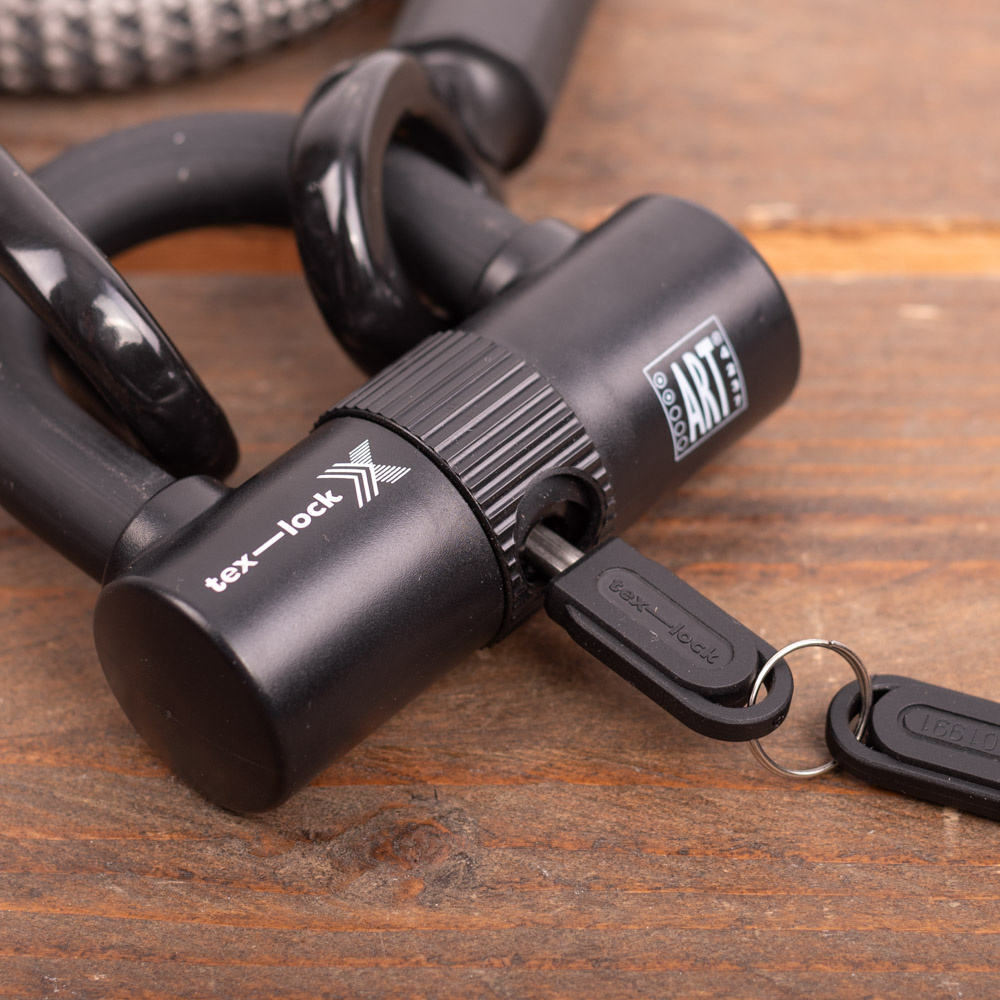 >>> De Tex-Lock die u hier ziet, is voorzien van zowel de compacte U-Lock als de langere X-Lock.