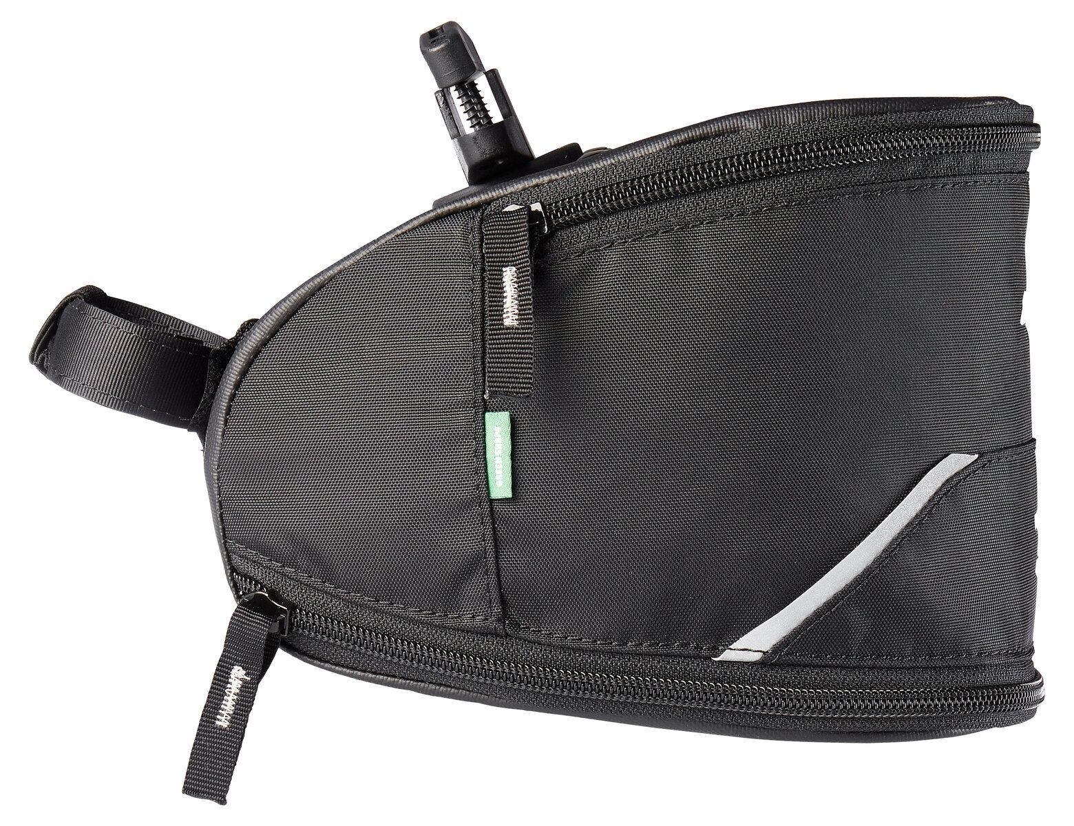 De zadeltas heeft een verstevigde boven- en onderkant en een inhoud van ca. 2 + 1 liter. Voor snelle toegang is de tas voorzien van een brede opening met een ritssluiting rondom. In het hoofdvak van de tas zit een extra steekvakje. Met de brede ritssluiting aan de onderkant van de tas kunt u het volume van de zadeltas vergroten.